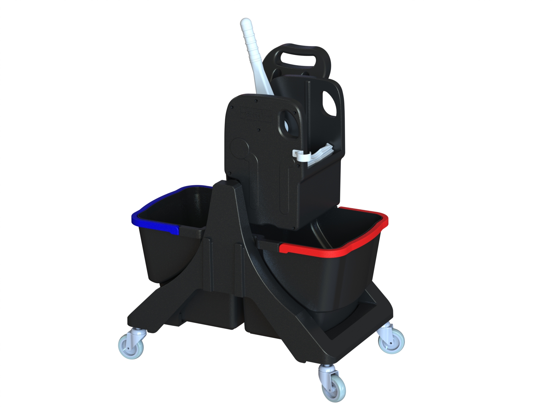 The ECOBLACK 450 includes a fully colour-coded bucket system to support hygienic cleaning routines. It comes with two 20-litre black buckets with blue and red handles, and four 6-litre black buckets with handles in blue, green, yellow, and red. These buckets are stored in a secure compartment with a manually lockable cover designed to prevent cross-contamination. The black recycled plastic wringer delivers efficient mop pressing and reduces water waste.